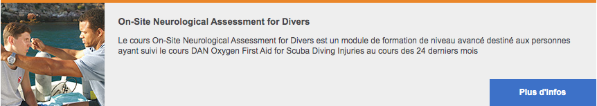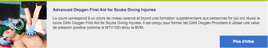 Le cours « DAN Oxygen Provider & Advanced » est destiné aux pratiquants d’activités nautiques (et à leur entourage) et, en particulier, la plongée sous marine. Ce cours est axé sur la reconnaissance des accidents nécessitant l'administration d'Oxygène pendant l'attente des services médicaux mais aussi sur la découverte du matériel à utiliser ainsi que l'usage des différents masques.