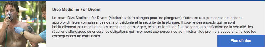 Ces cours aident les candidats à se familiariser avec la médecine de la plongée et avec les mesures à prendre en cas d'urgence de plongée, à travers un langage accessible à tous.
